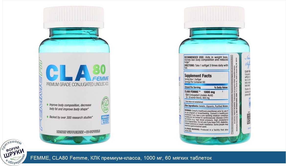 Друзья, если у вас есть отзыв/дополнение/комментарий/вопрос относительно FEMME, CLA80 Femme, КЛК премиум-класса, 1000 мг, 60 мягких таблеток - напишите его ответом в эту тему (это будет полезно всему сообществу в целом и вам в отдельности).