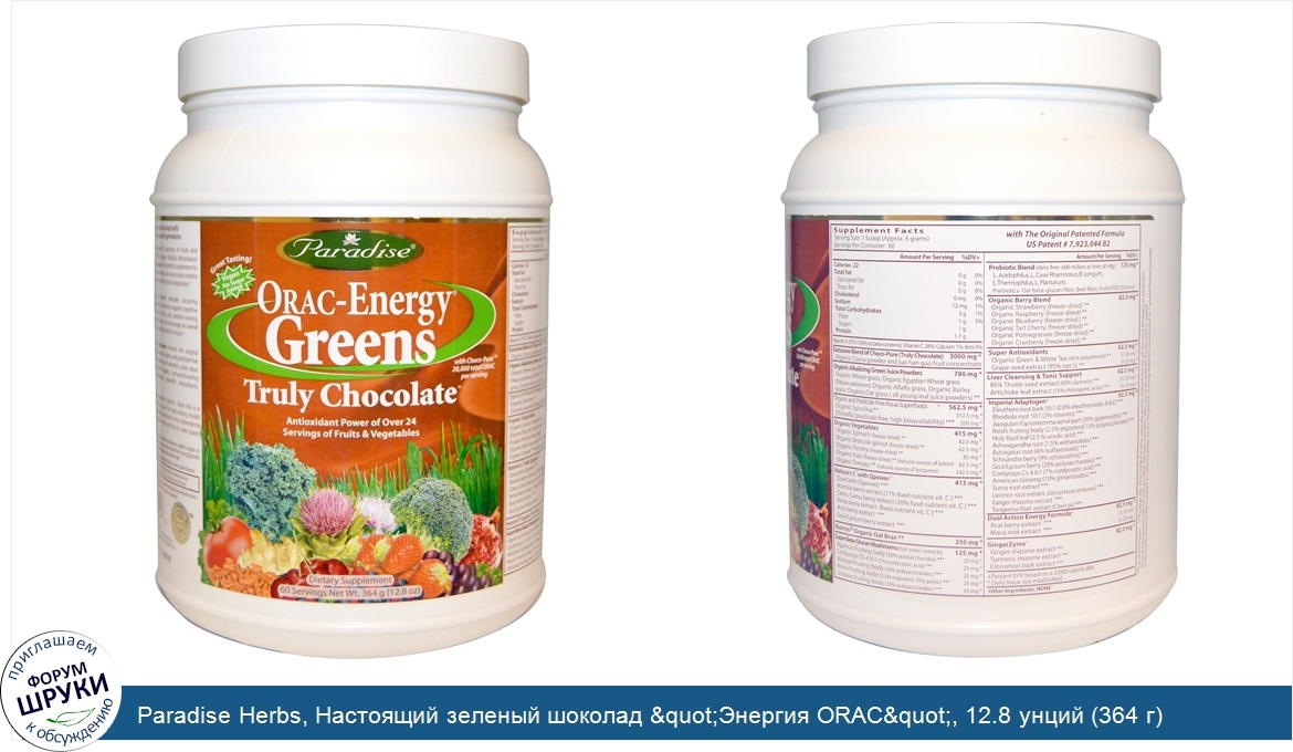 Друзья, если у вас есть отзыв/дополнение/комментарий/вопрос относительно Paradise Herbs, Настоящий зеленый шоколад "Энергия ORAC", 12.8 унций (364 г) - напишите его ответом в эту тему (это будет полезно всему сообществу в целом и вам в отдельности).