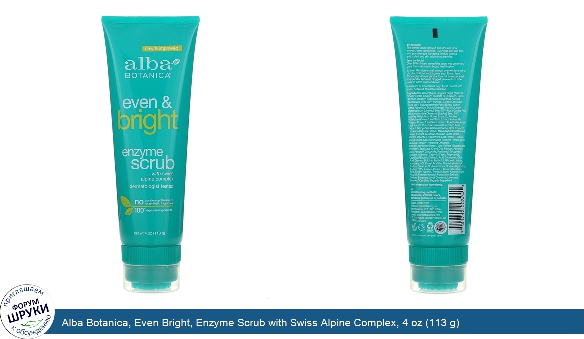 Друзья, если у вас есть отзыв/дополнение/комментарий/вопрос относительно Alba Botanica, Even Bright, Enzyme Scrub with Swiss Alpine Complex, 4 oz (113 g) - напишите его ответом в эту тему (это будет полезно всему сообществу в целом и вам в отдельности).