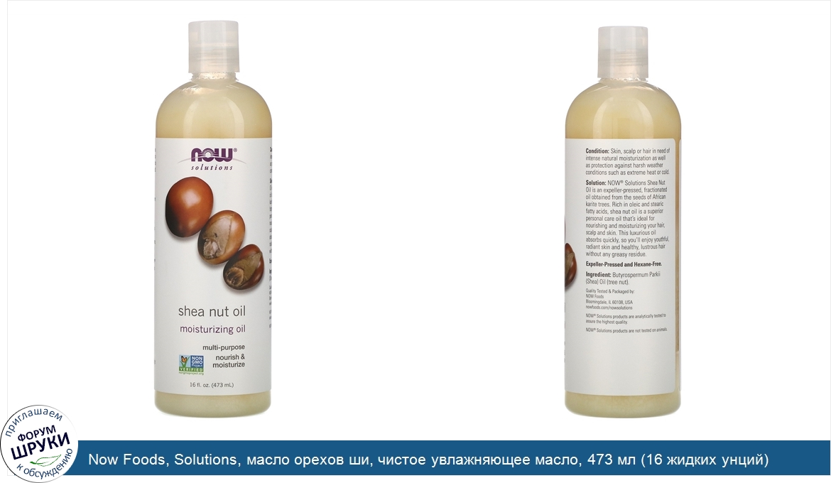 Друзья, если у вас есть отзыв/дополнение/комментарий/вопрос относительно Now Foods, Solutions, масло орехов ши, чистое увлажняющее масло, 473 мл (16 жидких унций) - напишите его ответом в эту тему (это будет полезно всему сообществу в целом и вам в отдельности).