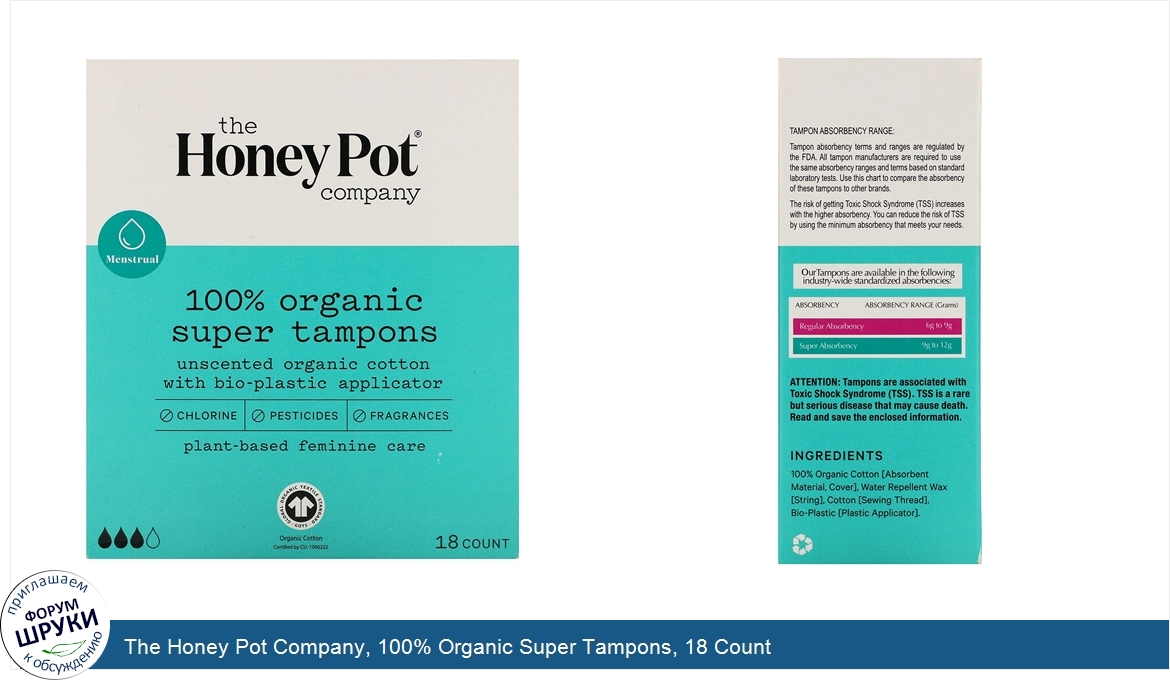 [DESCRIPT]GOTS- Global Organic Textile Standard. Organic Cotton Certified by CU: 1006222. You've Got This. Everything's Gonna Be Okay. Menstrual. Unscented Organic Cotton with Bio-Plastic Applicator. No Chlorine. No Pesticides. No Fragrances. Plant-Based Feminine Care. Made by Humans with Vaginas for Human with Vaginas. Because It Take One to Know One™. Durable Wrapper. Soft Bio-Plastic Applicator Easy to Insert. Bio-Plastic Applicator Is Derived From Sugarcane. Sustainable- Soft- Breath - Pesticides Free- Chlorine Free. Gynecologists Love It! Make Peace with Your Period™. Tampon Absorbency Range:. Tampon absorbency terms and ranges are regulated by the FDA. All tampon manufactures are required to use the same absorbency ranges and terms based on standard laboratory tests. Use this char to compare absorbency of these tampons to other brands. The risk of getting Toxic Shock Syndrome (TSS) increases with the higher absorbency. You can reduce the risk of TSS by using the minimum absorbency that meets your needs. Our Tampons are available in the following industry-wide standardized absorbencies:. Absorbency. Absorbency Range (Grams). Regular Absorbency. 6 g to 9 g. Super Absorbency. 9 g to 12 g. I was suffering with bacterial vaginosis for 8 months when an ancestor came to me in a dream and gifted me with a vision to heal myself.With her help I created the Honey Pot to solve for what other brands wouldn't through the power of herbs™. Width length expansion. - Conforms to your individual shape to provide unsurpassed protection. Secure withdrawal cord. - Withdrawal cord is sewn the full length of absorbent pellet. Textured finger grip -. Textured finger grip design for ultimate control while inserting your tampon. Absorbency you can trust, without all the chemicals. Get comfortable, get back to yourself.[/DESCRIPT]... (описание дополняется)