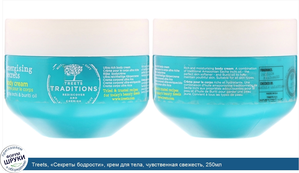 Друзья, если у вас есть отзыв/дополнение/комментарий/вопрос относительно Treets, «Секреты бодрости», крем для тела, чувственная свежесть, 250мл - напишите его ответом в эту тему (это будет полезно всему сообществу в целом и вам в отдельности).