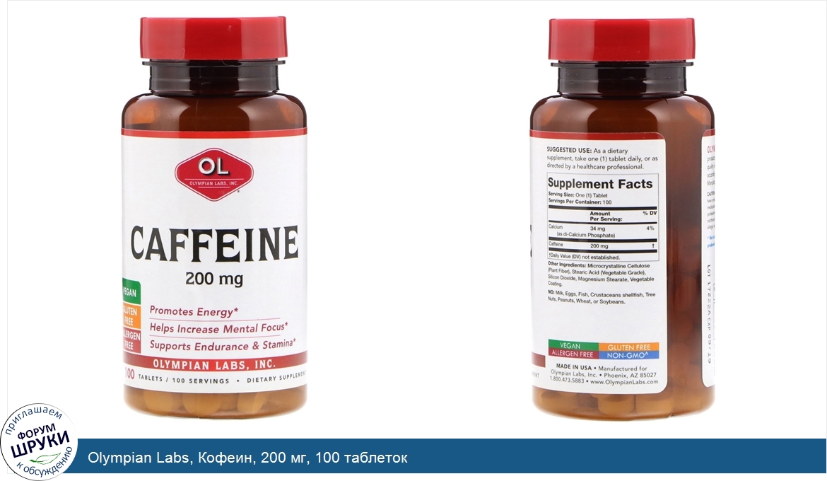 Olympian Labs, Кофеин, 200 мг, 100 таблеток