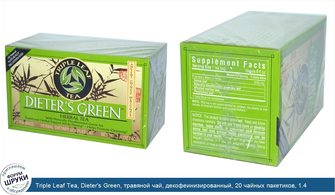 Triple Leaf Tea, Dieter's Green, травяной чай, декофеинизированный, 20 чайных пакетиков, 1.4 унций (40 г)