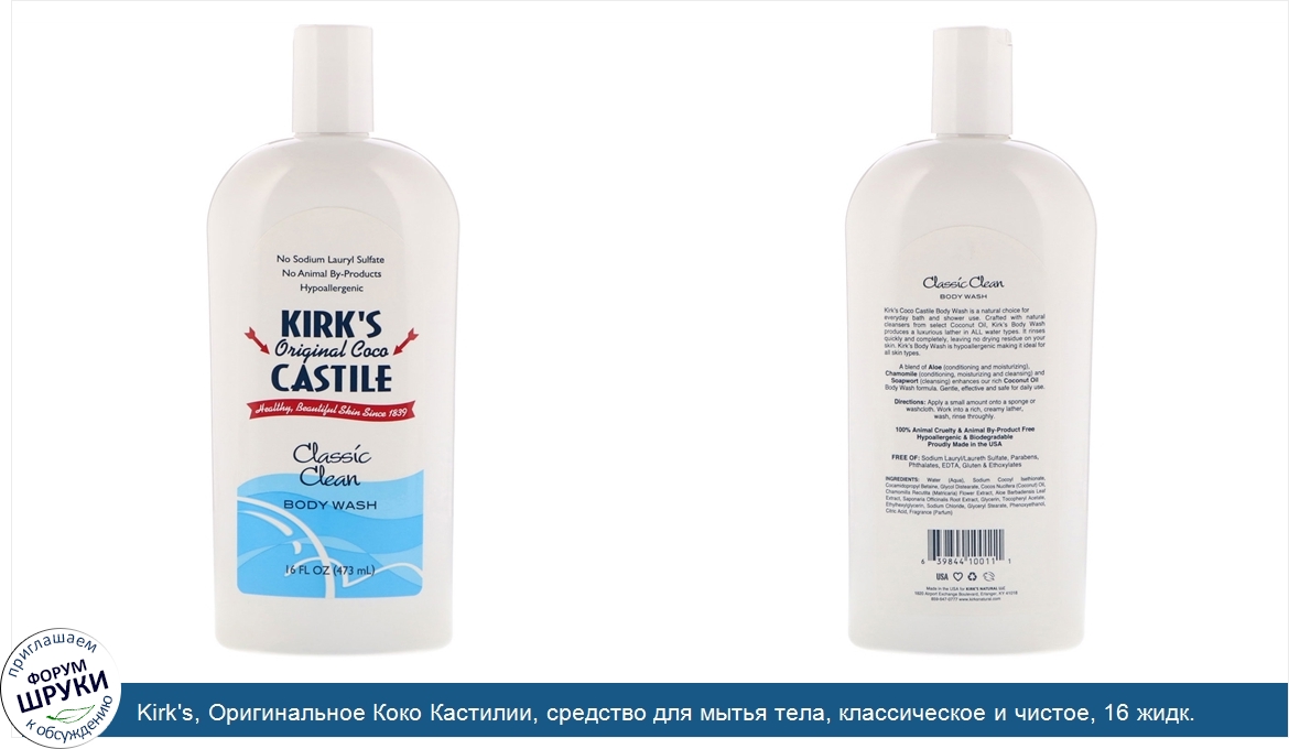 Kirk's, Оригинальное Коко Кастилии, средство для мытья тела, классическое и чистое, 16 жидк. унц. (473 мл)