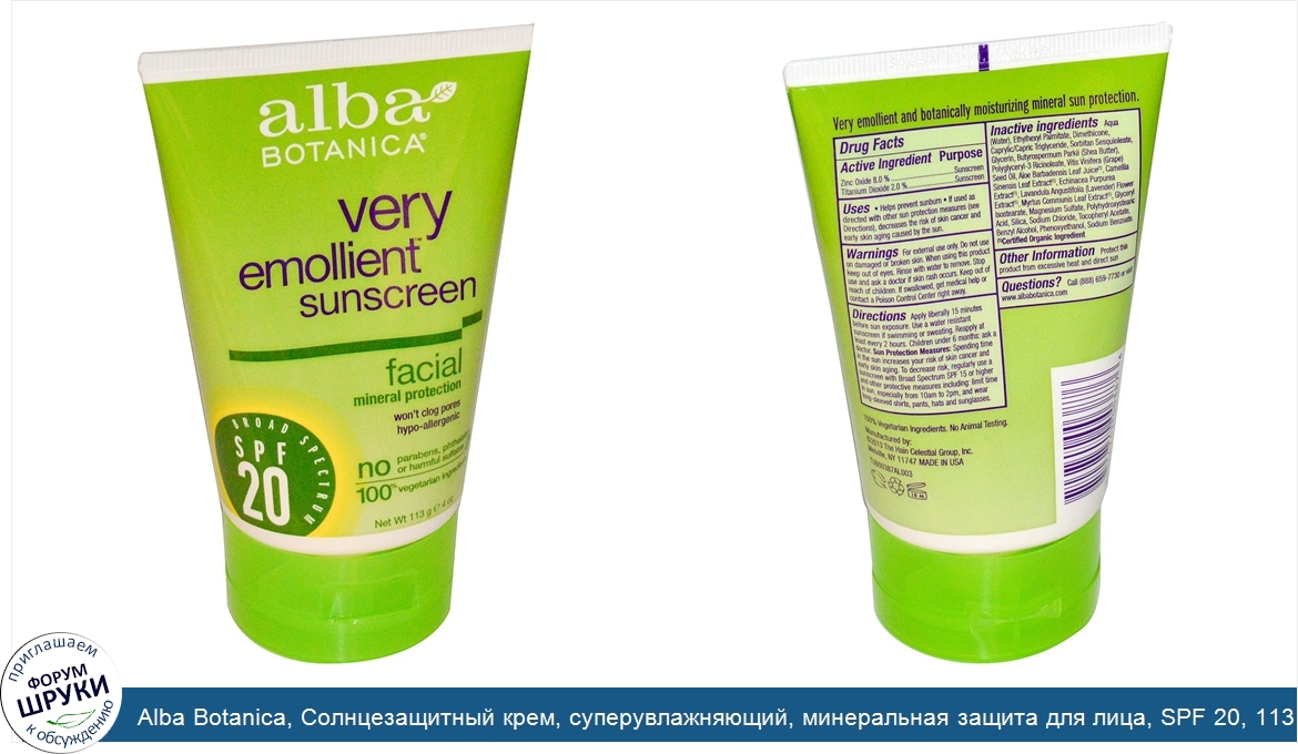 Alba Botanica, Солнцезащитный крем, суперувлажняющий, минеральная защита для лица, SPF 20, 113 г (4 унции)