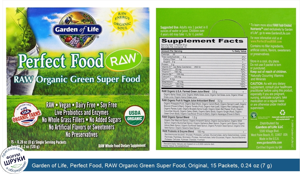 Друзья, если у вас есть отзыв/дополнение/комментарий/вопрос относительно Garden of Life, Perfect Food, RAW Organic Green Super Food, Original, 15 Packets, 0.24 oz (7 g) Each - напишите его ответом в эту тему (это будет полезно всему сообществу в целом и вам в отдельности).