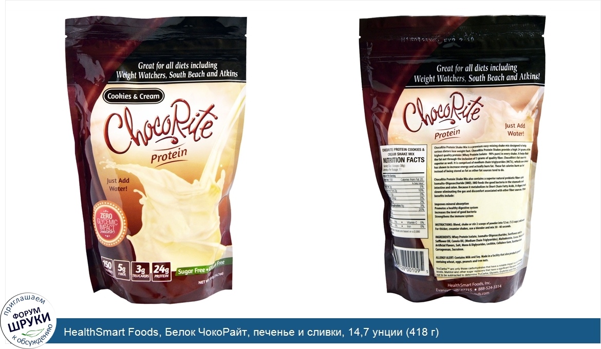 Друзья, если у вас есть отзыв/дополнение/комментарий/вопрос относительно HealthSmart Foods, Белок ЧокоРайт, печенье и сливки, 14,7 унции (418 г) - напишите его ответом в эту тему (это будет полезно всему сообществу в целом и вам в отдельности).