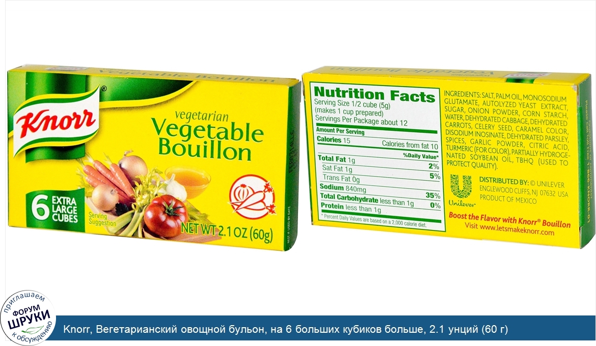 Друзья, если у вас есть отзыв/дополнение/комментарий/вопрос относительно Knorr, Вегетарианский овощной бульон, на 6 больших кубиков больше, 2.1 унций (60 г) - напишите его ответом в эту тему (это будет полезно всему сообществу в целом и вам в отдельности).