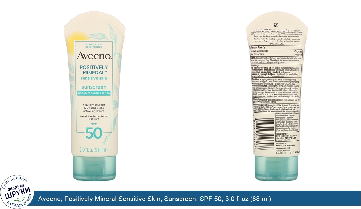 [DESCRIPT]Dermatologist Recommended. Broad Spectrum SPF 50. Naturally-Sourced. 100% Zinc Oxide Active Ingredients. Sweat + Water Resistant (80 Min). Dries Sheer on Skin. Fast Absorbing. Dries with a Matte Finish. Easy to Apply. Hypoallergenic. Fragrance-Free. Paraben-Free. Phthalate-Free. Dye - Free. TSA - Travel-Friendly Size. Heading outside? Aveeno® has got your skin covered so that you can enjoy the sun every day. Aveeno® Positively Mineral™ Lotion with Broad Spectrum SPF 50 contains 100% zinc oxide active ingredient goes beyond UVA/UVA protection. With nourishing oat, this non-greasy mineral sunscreen is gentle and non-irritating, even on sensitive skin. Use:. Helps prevent sunburn.[/DESCRIPT]... (описание дополняется)