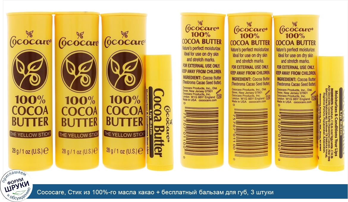 Друзья, если у вас есть отзыв/дополнение/комментарий/вопрос относительно Cococare, Стик из 100%-го масла какао + бесплатный бальзам для губ, 3 штуки - напишите его ответом в эту тему (это будет полезно всему сообществу в целом и вам в отдельности).