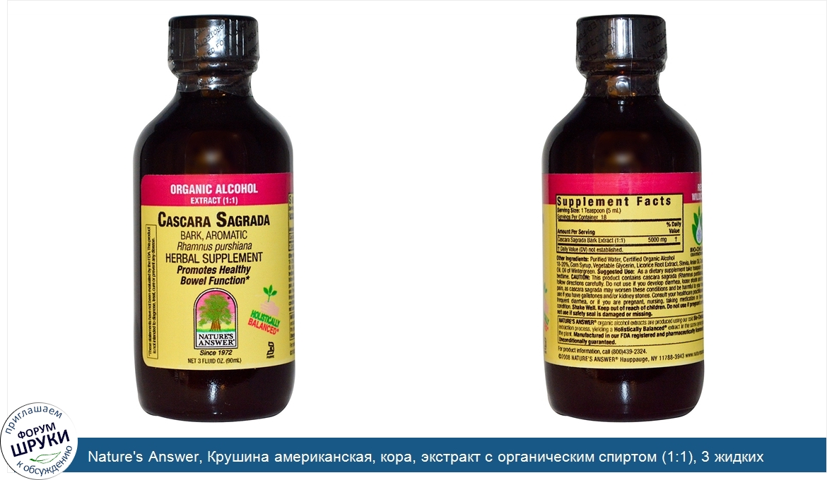 [DESCRIPT]Aromatic. Rhamnus Purshiana. Herbal Supplement. Promotes Healthy Bowel Function. Holistically Balanced. Since 1972. Kosher Parve. Responsibly Wildcrafted Herb. Bio-Chelated Cold Extraction Process. Nature's Answer organic alcohol extracts are produced using our cold Bio-Chelated proprietary extraction process, yielding a Holistically Balanced standardized extract. Liquid extracts are absorbed faster than tablets or capsules. Holistically Balanced guarantees that the constituents of the extract are in the same ratios as in the plant. Manufactured in our cGMP facility. Unconditionally guaranteed.[/DESCRIPT]... (описание дополняется)