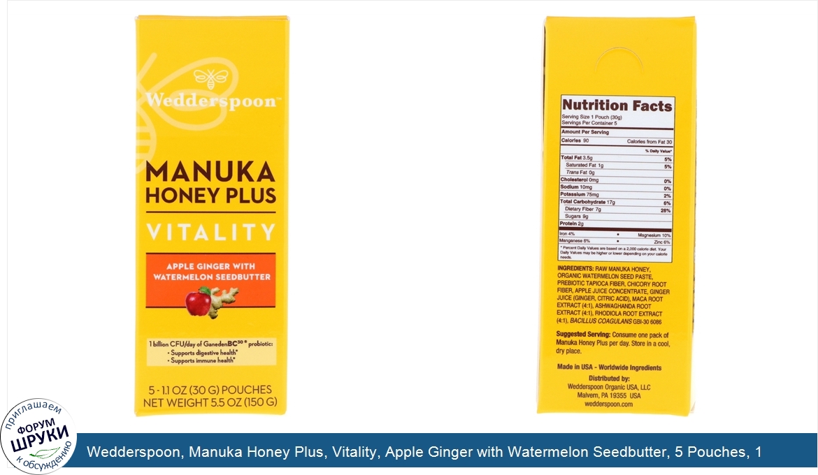 Друзья, если у вас есть отзыв/дополнение/комментарий/вопрос относительно Wedderspoon, Manuka Honey Plus, Vitality, Apple Ginger with Watermelon Seedbutter, 5 Pouches, 1.1 oz (30 g) Each - напишите его ответом в эту тему (это будет полезно всему сообществу в целом и вам в отдельности).