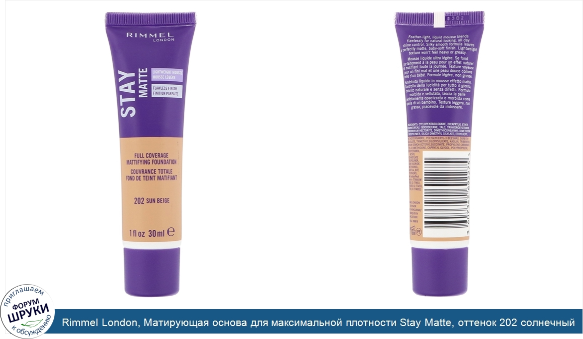 Rimmel London, Матирующая основа для максимальной плотности Stay Matte, оттенок 202 солнечный бежевый, 30мл