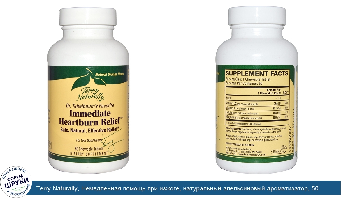 Друзья, если у вас есть отзыв/дополнение/комментарий/вопрос относительно Terry Naturally, Немедленная помощь при изжоге, натуральный апельсиновый ароматизатор, 50 жевательных таблеток - напишите его ответом в эту тему (это будет полезно всему сообществу в целом и вам в отдельности).