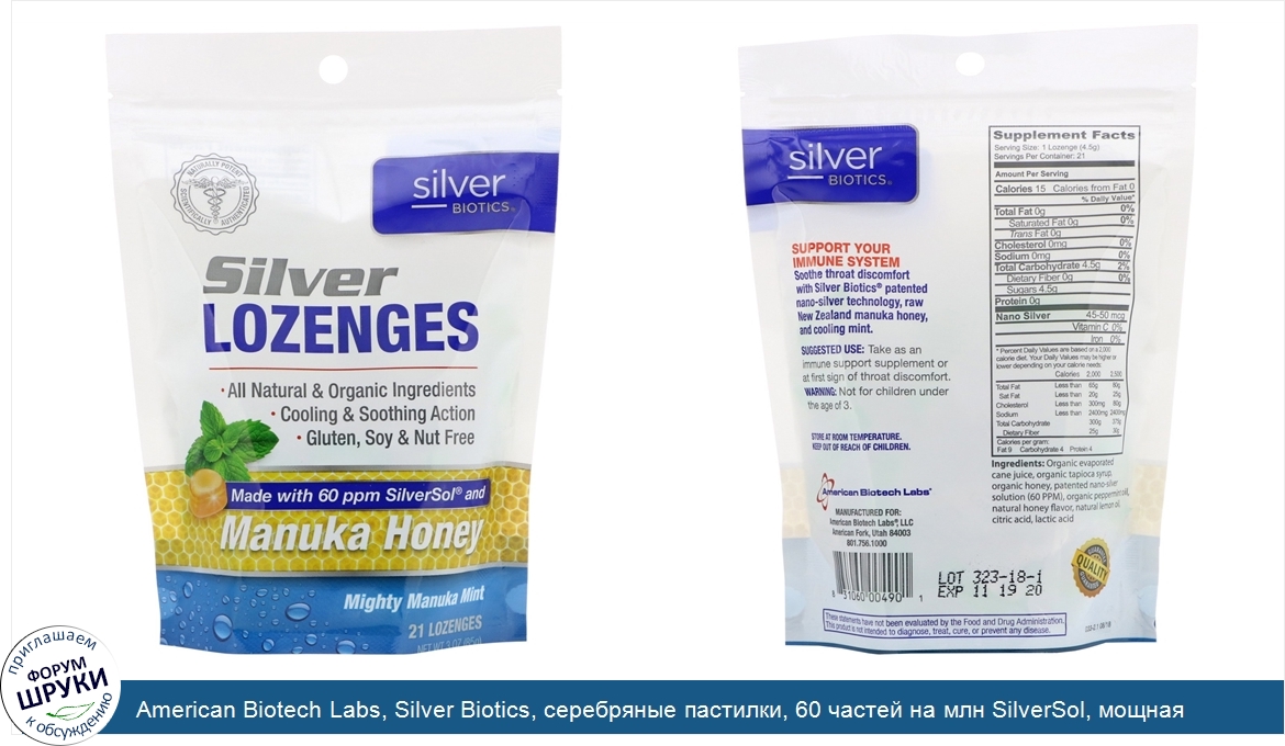 Друзья, если у вас есть отзыв/дополнение/комментарий/вопрос относительно American Biotech Labs, Silver Biotics, серебряные пастилки, 60 частей на млн SilverSol, мощная манука и мята, 21 пастилок - напишите его ответом в эту тему (это будет полезно всему сообществу в целом и вам в отдельности).