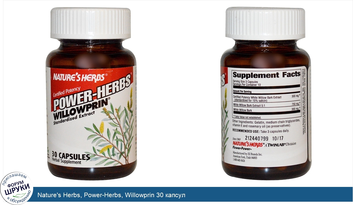 [DESCRIPT]Certified Potency. Standardized Extract. Herbal Supplement. Willowprin is a high quality, effective form of White Willow Bark extract. It is standardized at a high concentration of naturally-balanced active principles while retaining and enhancing the whole-plant synergistic benefits and is one of the world's finest and purest plant extracts. Contains no aspirin, starch, or artificial colors. Faster-acting and more assimilable than unconcentrated White Willow. Certified Potency is your guarantee of dependable consistent quality and potency in every capsule every time! Only from Nature's Herbs. Our exclusive FreshCare System inhibits normal plant oxidation, maintaining product potency and extending freshness. It includes all-natural antioxidants in each capsule, oxygen-absorbing packets in each bottle, special air-tight seals and amber glass packing for uncompromised quality.[/DESCRIPT]... (описание дополняется)