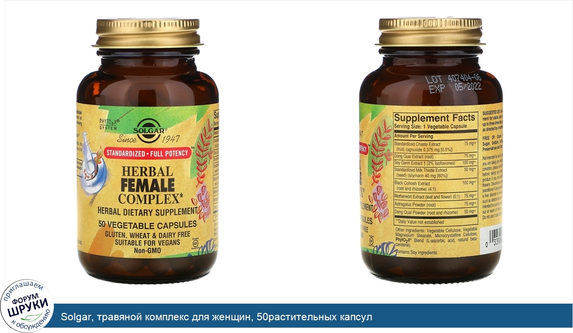 [DESCRIPT]Система PhytO2X. Компания основана в 1947 году. Стандартизированная добавка. Абсолютная эффективность. Растительная пищевая добавка. Подходит для вегетарианцев. Травяной комплекс для женщин от Solgar®. — это специализированная улучшенная формула, содержащая травяную смесь, необходимую для поддержания оптимального здоровья и самочувствия женщины.[/DESCRIPT]... (описание дополняется)