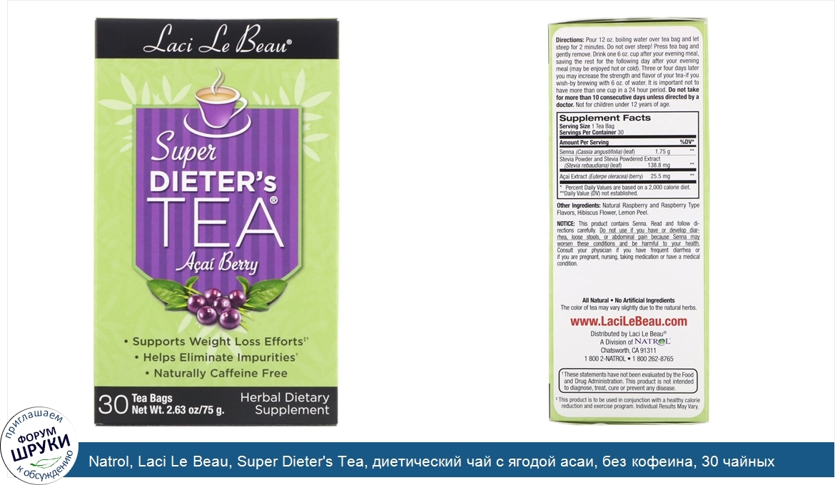 Друзья, если у вас есть отзыв/дополнение/комментарий/вопрос относительно Natrol, Laci Le Beau, Super Dieter's Tea, диетический чай с ягодой асаи, без кофеина, 30 чайных пакетиков, 2,63 унции (75 г) - напишите его ответом в эту тему (это будет полезно всему сообществу в целом и вам в отдельности).