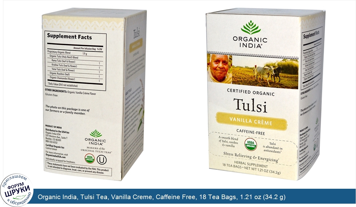 Organic India, Tulsi Tea, Vanilla Creme, Caffeine Free, 18 Tea Bags, 1.21 oz (34.2 g)