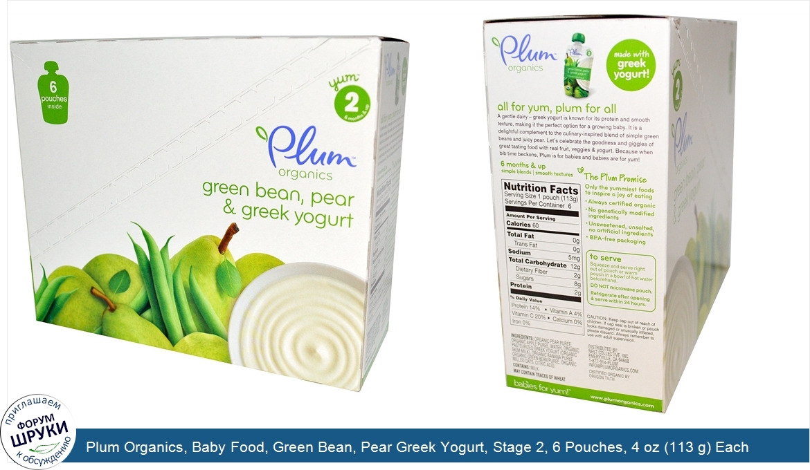 ru Plum Organics, Baby Food, Green Bean, Pear Greek Yogurt, Stage 2, 6 Pouches, 4 oz (113 g) Each
