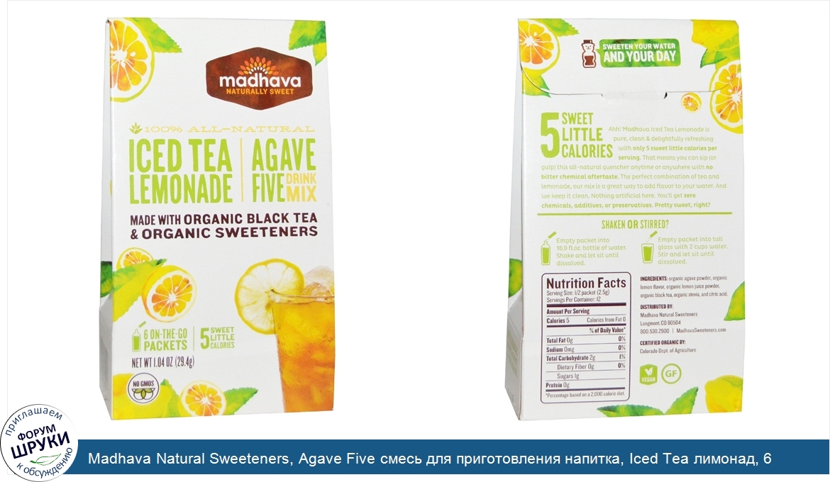 ru Madhava Natural Sweeteners, Agave Five смесь для приготовления напитка, Iced Tea лимонад, 6 пакетов, 1,04 унции (29,4 г)