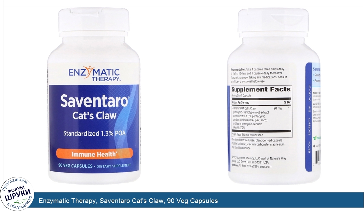 Друзья, если у вас есть отзыв/дополнение/комментарий/вопрос относительно Enzymatic Therapy, Saventaro Cat's Claw, 90 Veg Capsules - напишите его ответом в эту тему (это будет полезно всему сообществу в целом и вам в отдельности).
