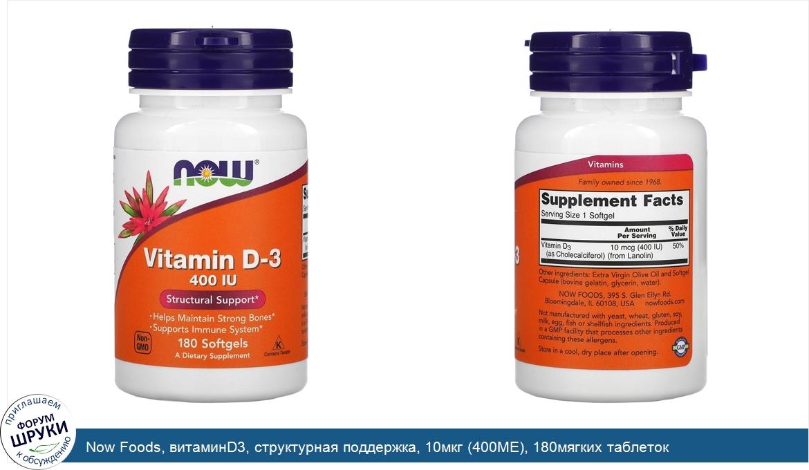 Друзья, если у вас есть отзыв/дополнение/комментарий/вопрос относительно Now Foods, витаминD3, структурная поддержка, 10мкг (400МЕ), 180мягких таблеток - напишите его ответом в эту тему (это будет полезно всему сообществу в целом и вам в отдельности).