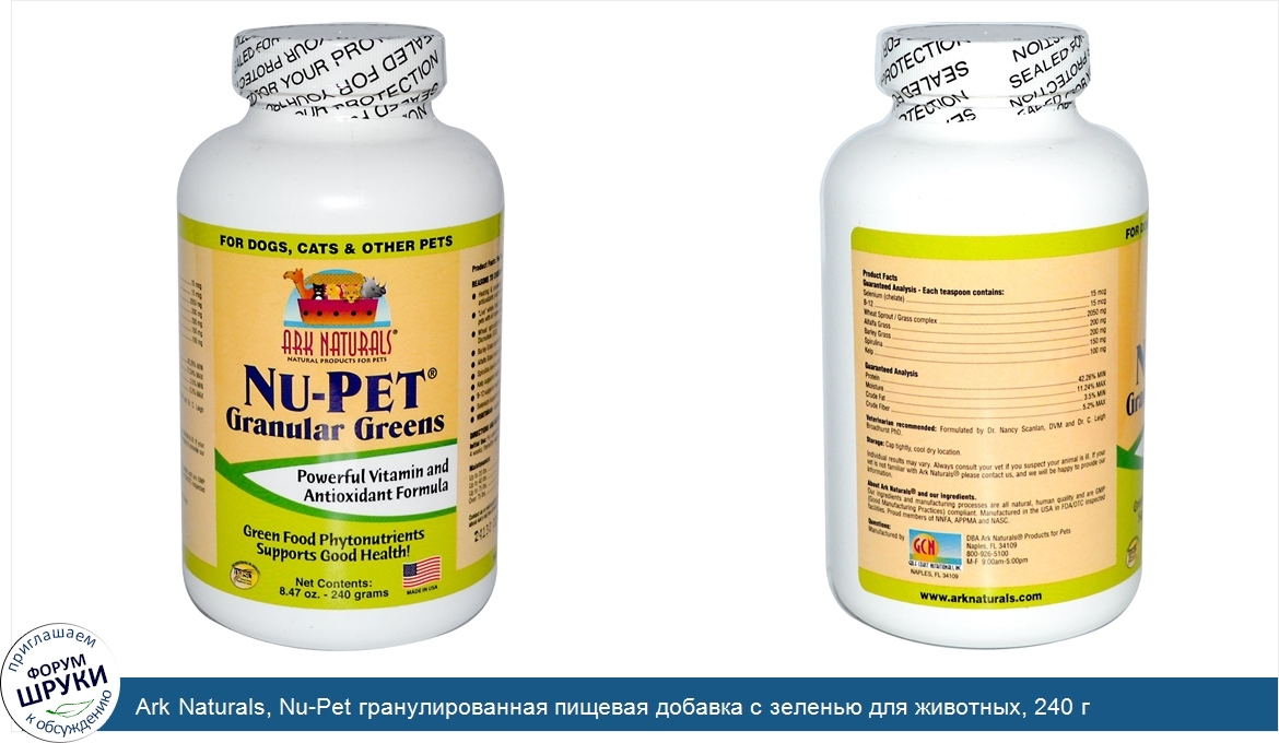 Друзья, если у вас есть отзыв/дополнение/комментарий/вопрос относительно Ark Naturals, Nu-Pet гранулированная пищевая добавка с зеленью для животных, 240 г - напишите его ответом в эту тему (это будет полезно всему сообществу в целом и вам в отдельности).