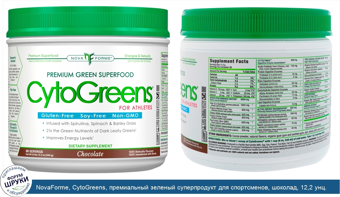 Друзья, если у вас есть отзыв/дополнение/комментарий/вопрос относительно NovaForme, CytoGreens, премиальный зеленый суперпродукт для спортсменов, шоколад, 12,2 унц. (345 г) - напишите его ответом в эту тему (это будет полезно всему сообществу в целом и вам в отдельности).