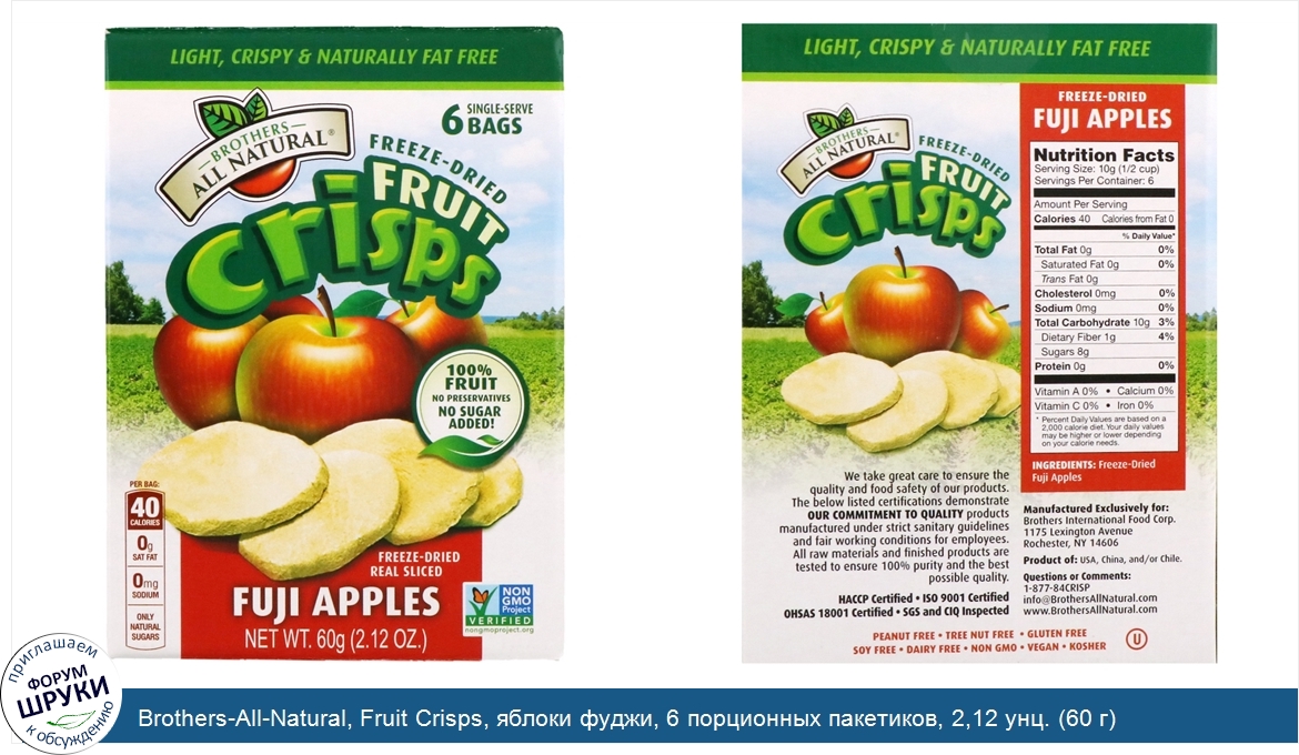 Друзья, если у вас есть отзыв/дополнение/комментарий/вопрос относительно Brothers-All-Natural, Fruit Crisps, яблоки фуджи, 6 порционных пакетиков, 2,12 унц. (60 г) - напишите его ответом в эту тему (это будет полезно всему сообществу в целом и вам в отдельности).