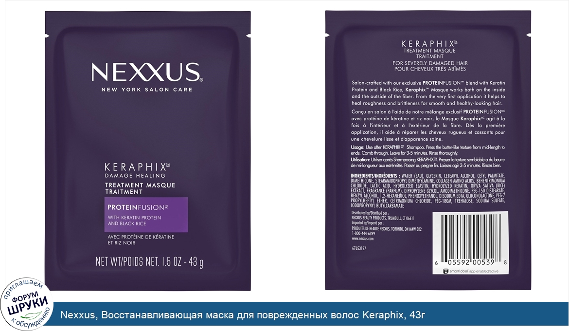[DESCRIPT]New York Salon Care. ProteinFusion. With Keratin Protein and Black Rice. For Severely Damaged Hair. At Nexxus, we know that hair is made of around 90% proteins, which is why we use advanced scientific methods to identify the protein needs of each hair type. We create customized formulas, with proteins, to bring your hair back to life. Keraphix™ Masque, with our exclusive ProteinFusion blend with Keratin Protein and Black Rice, works both on the inside and the outside of the fiber. From the very first application it helps to heal roughness and brittleness for smooth and healthy-looking hair.[/DESCRIPT]... (описание дополняется)