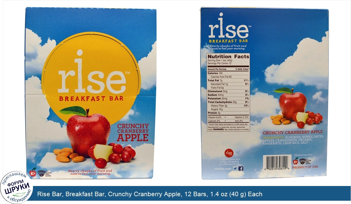 Друзья, если у вас есть отзыв/дополнение/комментарий/вопрос относительно Rise Bar, Breakfast Bar, Crunchy Cranberry Apple, 12 Bars, 1.4 oz (40 g) Each - напишите его ответом в эту тему (это будет полезно всему сообществу в целом и вам в отдельности).