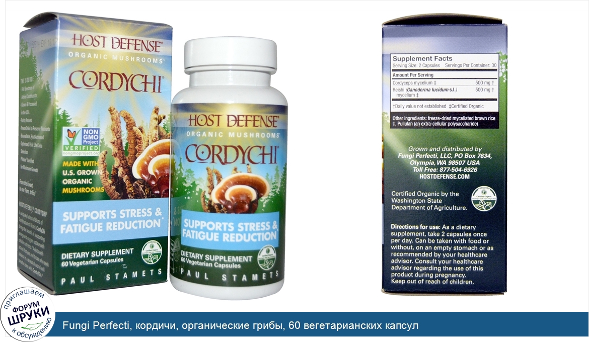 No GMO Project Verified. Made With U.S. Grown Organic Mushrooms. Supports Stress Fatigue Reduction. Dietary Supplement. Producer - Certified Organic - Washington State Dept of Agriculture. Host Defense CordyChi u...