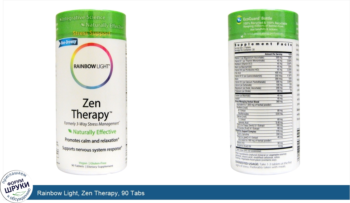 Друзья, если у вас есть отзыв/дополнение/комментарий/вопрос относительно Rainbow Light, Zen Therapy, 90 Tabs - напишите его ответом в эту тему (это будет полезно всему сообществу в целом и вам в отдельности).