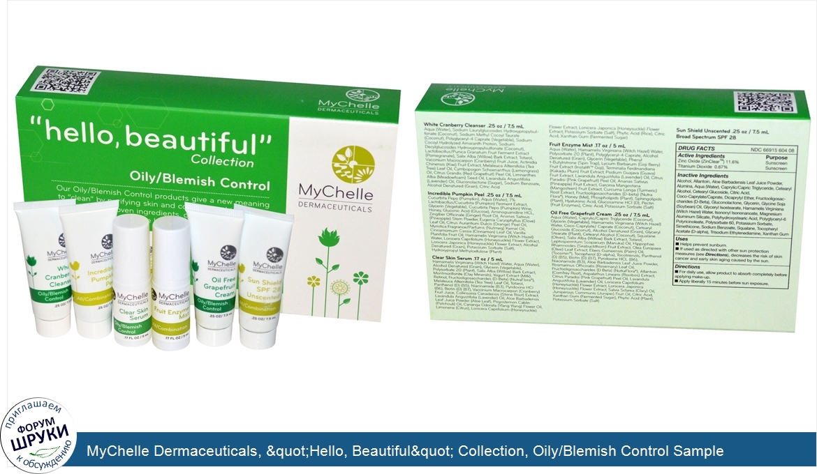 [DESCRIPT]Seeded in Science and Rooted in Nature. Our Oily/Blemish Control products give a new meaning to "clean" by purifying skin and controlling shine. Using clinically proven ingredients, our carefully designed formulas encourage healing and promote balance. Hi, there. MyChelle here. We think it's high time that skin care products quit it with the harsh chemicals and start fresh with naturally powerful ingredients. Now, you may be thinking, Skin care products that are effective and natural? Really? To which we're tickled pick to answer, Yes and yes. So now, you really can have it all. At MyChelle Dermaceuticals, we know beauty is so much more than skin deep. It's self deep. We give you what you need to always look forward to looking beautiful—today and every single tomorrow. The MyChelle Team. Kit contains:. White Cranberry Cleanser, Oily/Blemish Control. ,.25 oz (7.5 ml). Incredible Pumpkin Peel, All Combination. ,.25 oz (7.5 ml). Clear Skin Serum, Oily/Blemish Control. ,.17 fl oz (5ml). Fruit Enzyme Mist, All/Combination. ,.17 fl oz (5ml). Oil Free Grapefruit Cream, Oily/Blemish Control. ,.25 oz (7.5 ml). Sun Shield SPF 28 Unscented, All/Combination. ,.25 oz (7.5 ml). Step 1 : White Cranberry Cleanser. Deep pore clearing, oil balancing and skin refining exfoliating cleanser. Naturally exfoliating and pore clearing cleanser brings skin into healthy balance. Willow Bark and SCO2 Totarol help bring balance to oily and blemish-prone skin conditions. Pomegranate, a super fruit rich in antioxidants and naturally exfoliating fruit acids, protects against environmental aggressors, while keeping pores clear and skin calm. Step 2 : Incredible Pumpkin Peel. (1-3 times a week). Enzymatically rich therapy for deep stimulation and detoxification. Exfoliate and deeply nourish skin with this award-winning formula of pumpkin pulp, enzymes and fermented juice. Loaded with antioxidants, this fortifying peel rejuvenates and supports cellular integrity while clearing pores and aiding detoxification. Skin is left feeling incredibly soft, smooth and clean with a renewed healthy glow. Due to the highly effective nature of this peel, a patch test is recommended prior to use. Step 3 : Clear Skin Serum. Powerful bioactives deeply calm, balance oil and keep pores purified. Potent formula minimizes surface shine while improving the clarity of oily and blemish-prone skin. Retinol resurfaces skin and clears pore-blocking debris while Montmorillonite clay detoxifies and absorbs excess oil. SCO2 Totarol, a botanically-derived antibacterial, and B vitamins assist in the growth and repair of skin tissues. Step 4 : Fruit Enzyme Mist. Enzymatically rich mist to repair, protect and hydrate. Powerfully repairs youthful radiance, firmness and tone while protecting moisture levels and rehydrating for superior moisture regulation. Antioxidant turmeric strengthens and vitamin C-rich super fruit mangosteen supports collagen to help skin maintain youthful-looking firmness and structure. Pectin and Pineapple help resurface by boosting natural exfoliation for ultra-soft and smooth skin. Step 5 : Oil Free Grapefruit Cream. Lightweight restorative cream with Totarol to control blemish-prone skin. Lightweight hydration that nourishes breakout-prone skin without clogging pores. Nutrients-rich Sea Buckthorn promotes rapid healing of irritated skin. Naturally antibacterial Manuka Oil and SCO2 Totarol help protect against blemishes as Salicylic Acid gently eliminates pore blockage. Antioxidant Rooibos calms irritation and promotes cell repair. Step 6 : Sun Shield Unscented Broad Spectrum SPF 28. Chemical-free protection with ZinClear and Titanium Dioxide to protect against UV damage. Unscented, environmentally-safe, full spectrum UVA/UVB sun defense that offers powerfully effective protection and is non-irritating near the eyes. Translucent Zinc and Titanium Dioxides provide a safe alternative to harsh chemical sunscreens. The addition of soothing aloe and vitamin E help reduce signs of sun induced irritation. Uses:. Helps prevent sunburn. If used as directed with other sun protection measures (see Directions), decreases the risk of skin cancer and early skin aging caused by the sun. Sun Shield SPF 28 Unscented. Unscented, environmentally-safe, full spectrum UVA/UVB sun defense that offers powerfully effective protection and is non-irritating near the eyes. Translucent Zinc and Titanium Dioxides provide a safe alternative to harsh chemical sunscreens. The addition of soothing aloe and vitamin E help reduce signs of sun induced irritation.[/DESCRIPT]... (описание дополняется)