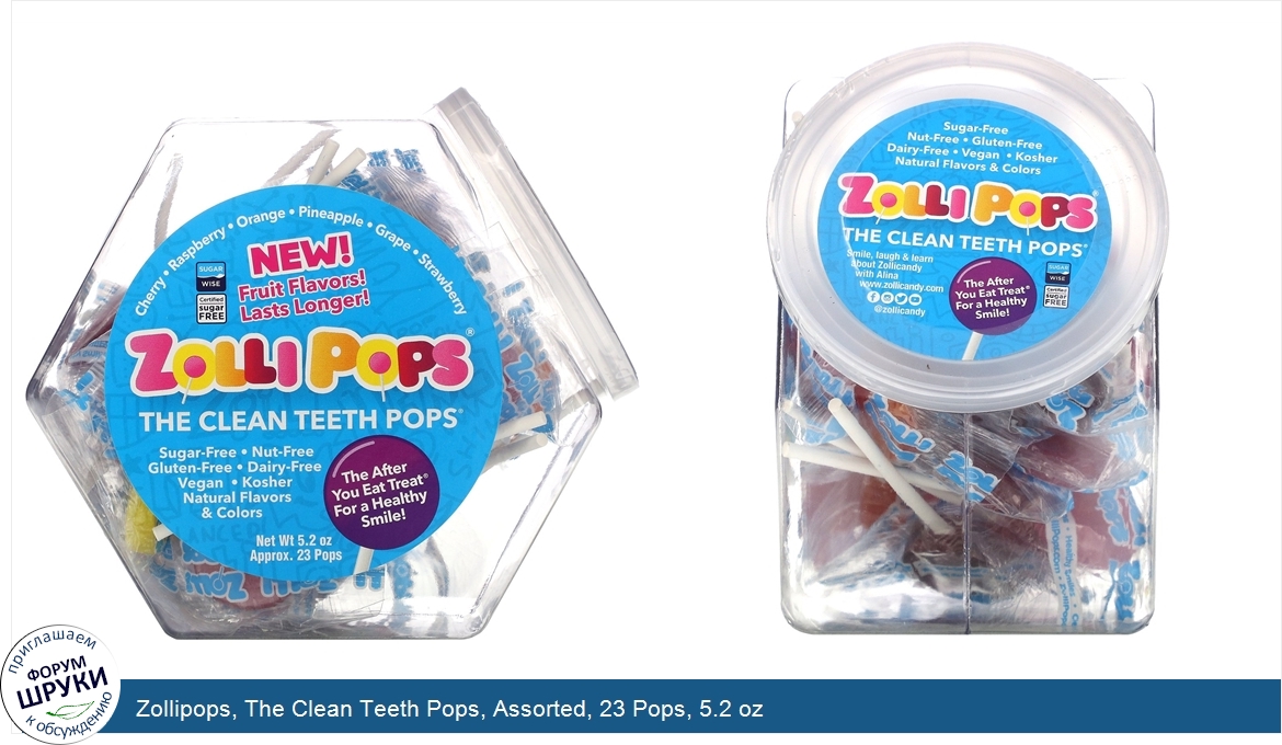 [DESCRIPT]Cherry, Raspberry, Orange, Pineapple, Grape, Strawberry. Fruit Flavors! Lasts Longer! Sugar Wise. Certified Sugar Free. Nut-Free. Gluten-Free. Dairy-Free. Vegan. Kosher. Natural Flavors Colors. The After You Eat Treat® for a Healthy Smile! Approx. 23 Pops. Smile, Laugh Learn about Zollicandy with Alina.[/DESCRIPT]... (описание дополняется)
