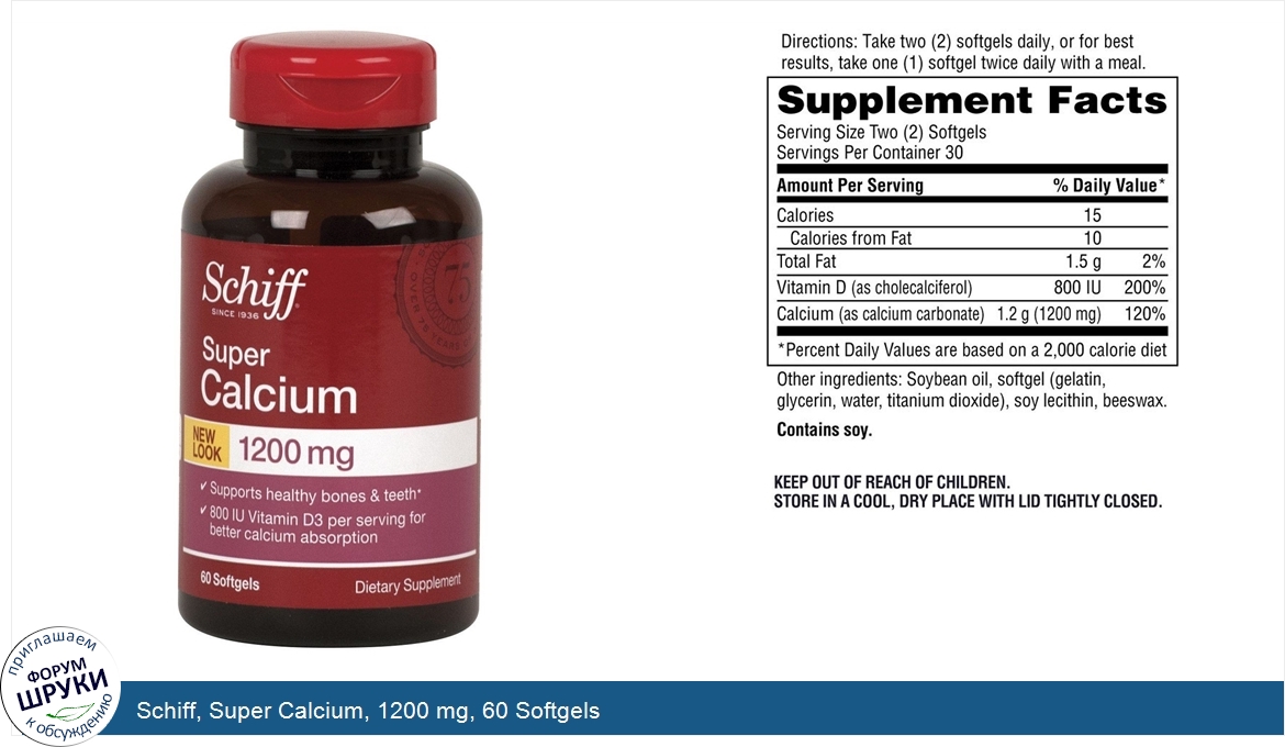 Друзья, если у вас есть отзыв/дополнение/комментарий/вопрос относительно Schiff, Super Calcium, 1200 mg, 60 Softgels - напишите его ответом в эту тему (это будет полезно всему сообществу в целом и вам в отдельности).