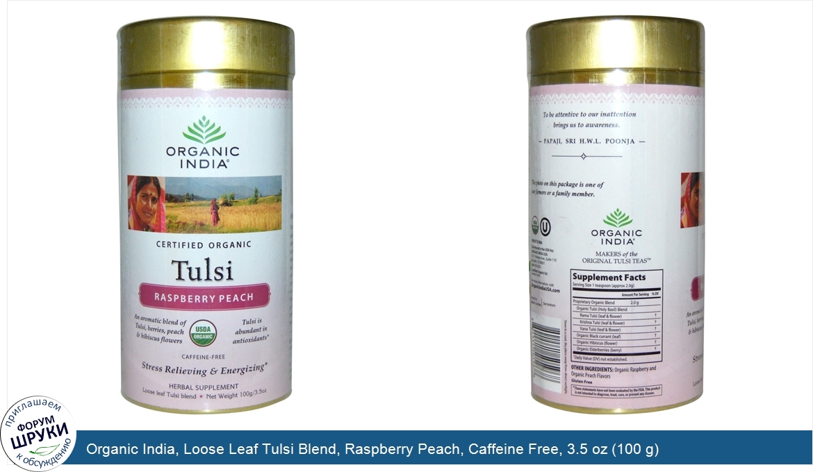 Organic India, Loose Leaf Tulsi Blend, Raspberry Peach, Caffeine Free, 3.5 oz (100 g)
