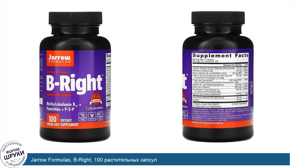 [DESCRIPT]Low-Odor B-Complex. Optimized B-Complex. Methylcobalamin B12 + Pantethine + P-5-P. 4th Generation - Folic Acid Technology. Dietary Supplement. Quatrefolic®. Gluten Free. Vegan. Veggie Cap. Suitable for Vegetarians/Vegans. B-Right® is a carefully-balanced, low-odor vitamin B-Complex formula. Methyl folate ((6S)-5-methyltetrahydrofolate or (6S)-5-MTHF) is the most biologically active form of folate. Quatrefolic® is the 4th generation development in folate delivery. Methylcobalamin is better absorbed, retained and utilized than other forms of B12. Methylcobalamin and niacin support brain and nerve tissue. Pantethine is a derivative of vitamin B5 and is a precursor to Coenzyme A (CoA), which is involved in oxidative metabolism. Pyridoxal 5-Phosphate (P-5-P) is the coenzyme form of vitamin B6 and is necessary for the metabolism of proteins and amino acids.[/DESCRIPT]... (описание дополняется)