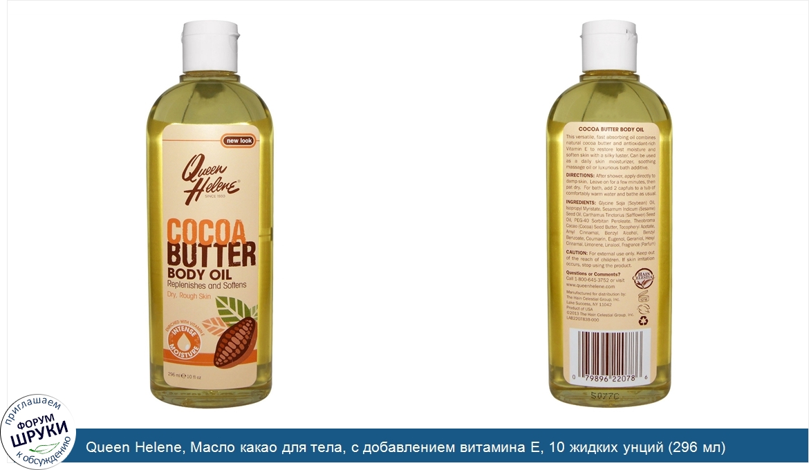 Друзья, если у вас есть отзыв/дополнение/комментарий/вопрос относительно Queen Helene, Масло какао для тела, с добавлением витамина Е, 10 жидких унций (296 мл) - напишите его ответом в эту тему (это будет полезно всему сообществу в целом и вам в отдельности).