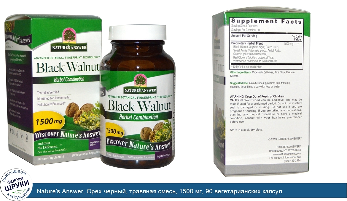 Друзья, если у вас есть отзыв/дополнение/комментарий/вопрос относительно Nature's Answer, Орех черный, травяная смесь, 1500 мг, 90 вегетарианских капсул - напишите его ответом в эту тему (это будет полезно всему сообществу в целом и вам в отдельности).