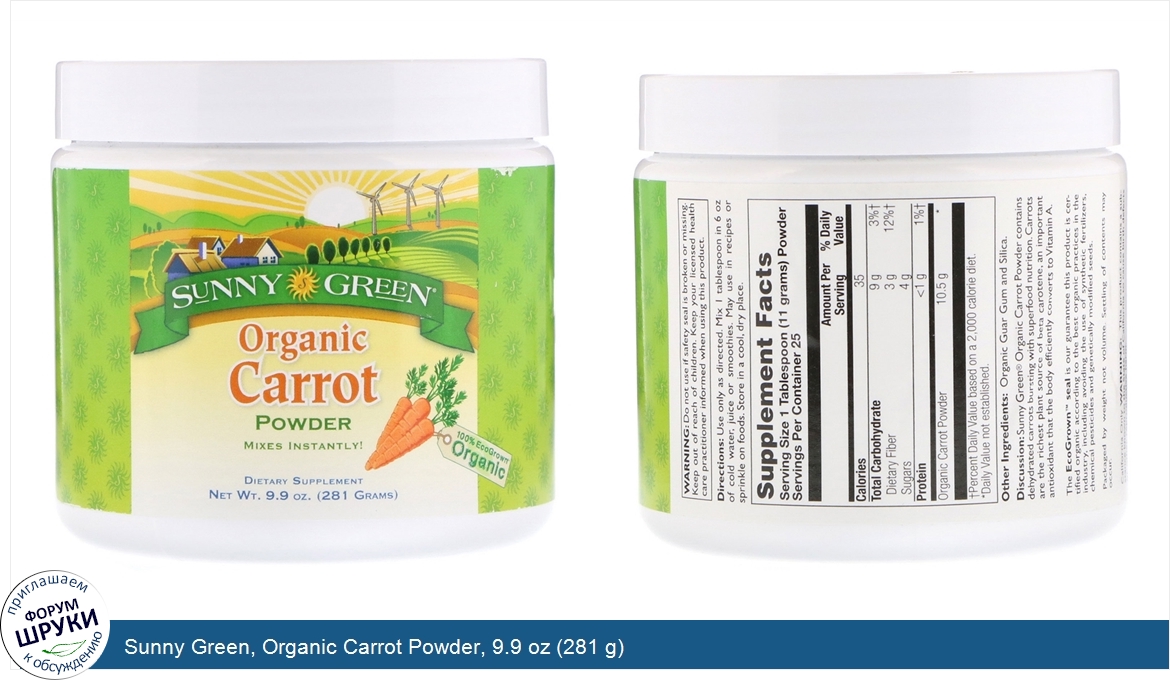 Drink Your Colors! . Mixes Instantly! . Dietary Supplement. 100% EcoGrown Organic. Certified Organic by Utah Dept. of Agriculture Food. Discussion. : Sunny Green Organic Carrot Powder contains dehydrated carrots ...