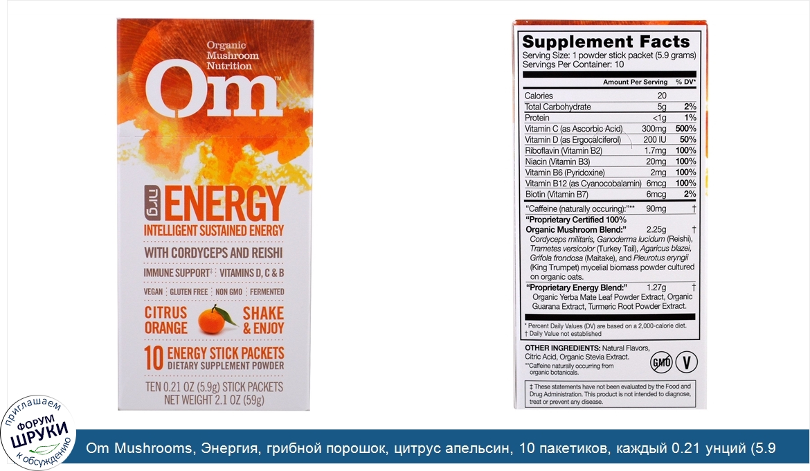 [DESCRIPT]Intelligent Sustained Energy. With Cordyceps and Reishi. Immune Support. Vitamins D, C B. Vegan - Gluten Free - Non GMO - Fermented. Shake Enjoy. 10 Energy Stick Packets. Dietary Supplement Powder. Om Energy Intelligent Sustained Energy. Supercharge your life with the powerful synergy of six medicinal mushrooms enhanced with the natural, smooth, non-jittery and sustained energy source from Yerba Mate and Turmeric. This scientifically based formula also supports your immune system with high levels of antioxidants, powerful beta glucans, and vitamins C, D, B2, B6, B7 and B12. Major Support Benefits:. Sustained Clean Energy. Focus Alertness. Immune Support. Great for pre-workout and recovery. No crash or jitters, just natural positive energy! Om Energy. The healthy, low calorie, sugar-free energizing drink powered by the synergy of six powerful organic medicinal mushrooms, botanicals and natural plant-based caffeine.[/DESCRIPT]... (описание дополняется)