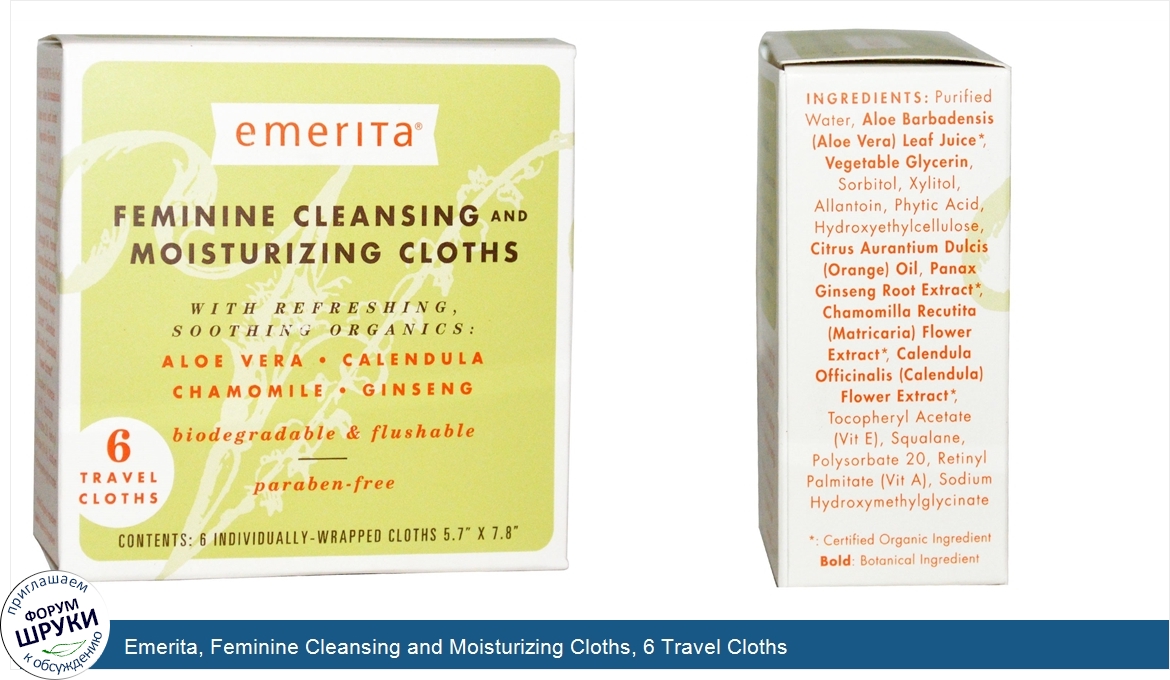 Emerita, Feminine Cleansing and Moisturizing Cloths, 6 Travel Cloths
