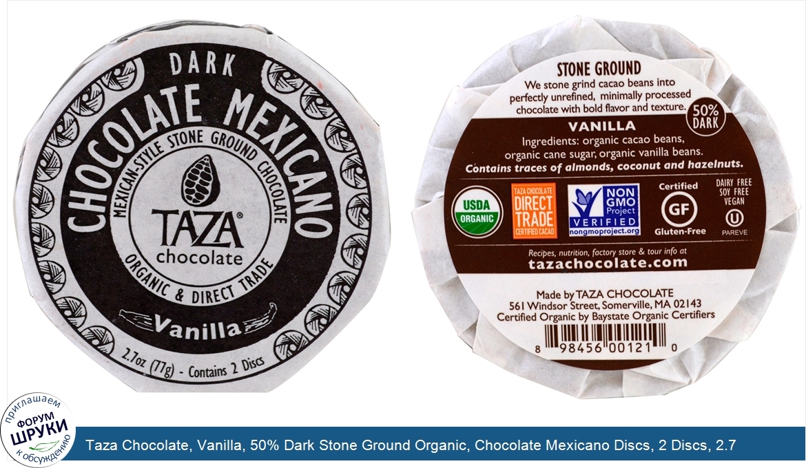 Друзья, если у вас есть отзыв/дополнение/комментарий/вопрос относительно Taza Chocolate, Vanilla, 50% Dark Stone Ground Organic, Chocolate Mexicano Discs, 2 Discs, 2.7 oz (77 g) - напишите его ответом в эту тему (это будет полезно всему сообществу в целом и вам в отдельности).