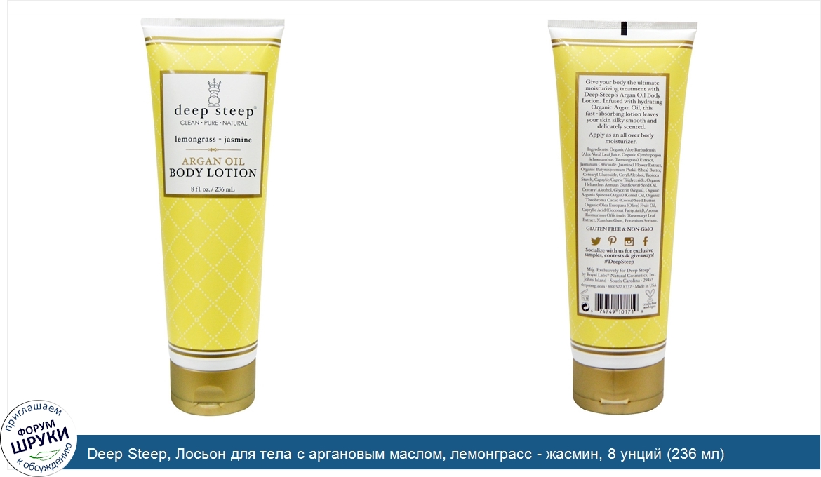 Друзья, если у вас есть отзыв/дополнение/комментарий/вопрос относительно Deep Steep, Лосьон для тела с аргановым маслом, лемонграсс - жасмин, 8 унций (236 мл) - напишите его ответом в эту тему (это будет полезно всему сообществу в целом и вам в отдельности).