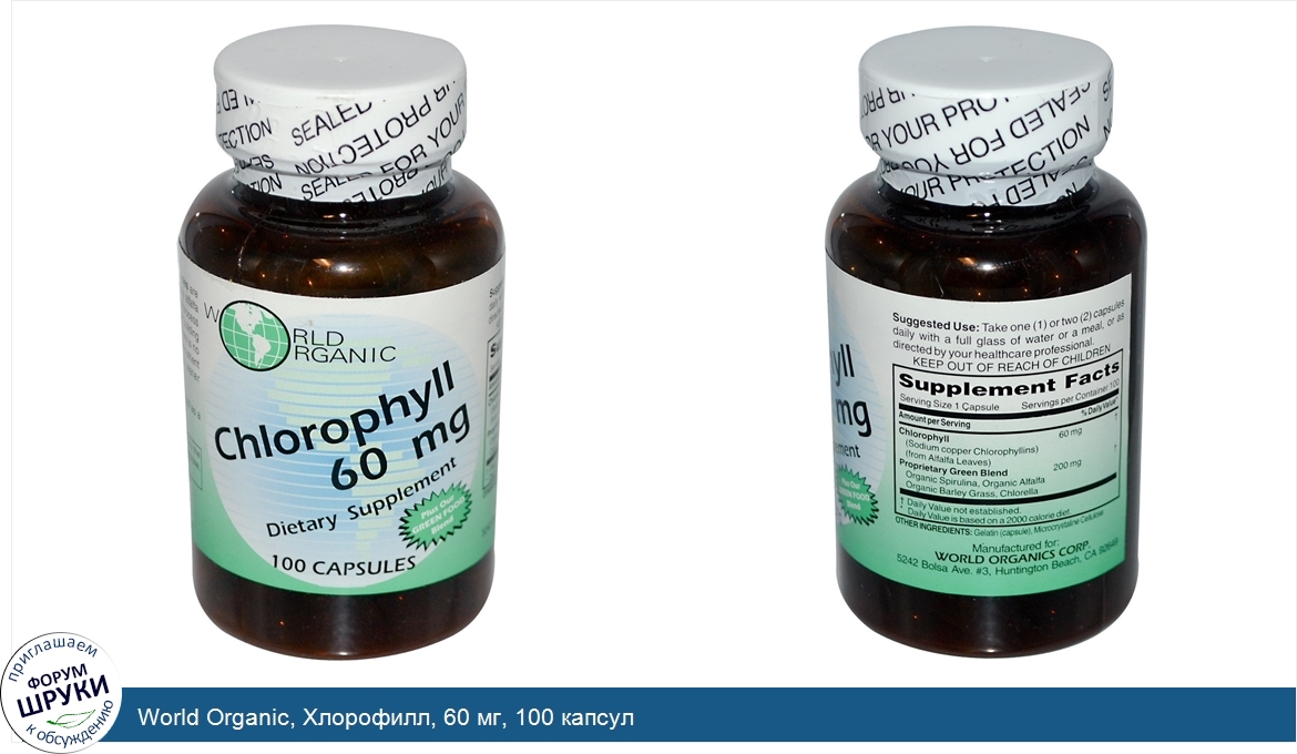 World Organic, Хлорофилл, 60 мг, 100 капсул