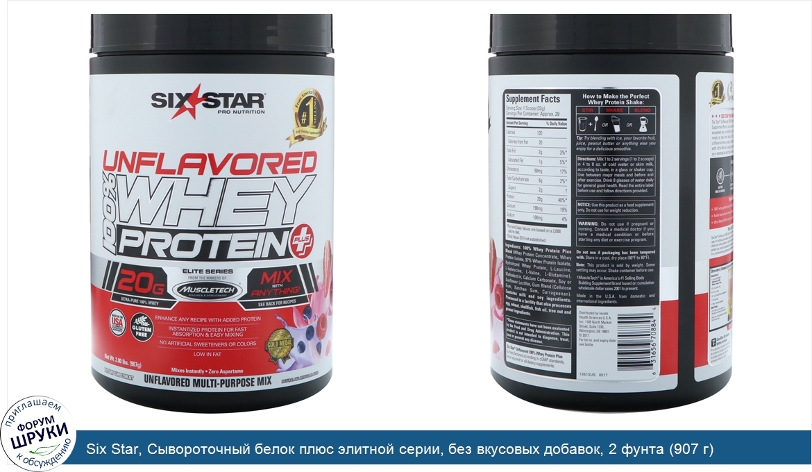 [DESCRIPT]Профессиональное питание. От создателей бренда продуктов для бодибилдинга № 1 в Америке. ‡. 20 г ультра чистой 100% сыворотки. Смешивайте с любыми продуктами! . От создателей и разработчиков продуктов MuscleTech. Улучшайте любое блюдо, обогащая его состав протеином. Быстрорастворимый протеин для быстрого усвоения и удобного смешивания. Без искусственных подсластителей или красителей. Низкое содержание жира. Изготовлен в США из местных и импортных ингредиентов. Не содержит глютена. Золотая медаль "American Masters of Taste" за превосходный вкус. Пищевая добавка. Моментальное растворение • Без аспартама. Универсальная смесь без вкуса. Натуральные и искусственные ароматизаторы. 20 лет выдающегося качества. Лидер в области науки. Гарантированное отсутствие запрещенных веществ. Произведено в соответствии со стандартами cGMP согласно требованиям для пищевых добавок. 100% сывороточный протеин Six Star Plus без ароматизаторов подойдет любым спортсменам. 100% сывороточный протеин Six Star Plus без ароматизаторов разработан создателями MuscleTech, самого популярного в Америке бренда пищевых добавок, так что вы можете доверять эффективности и качеству этой формулы. Не имеет значения, пришли ли вы в тренажерный зал впервые, или вы уже давно занимаетесь силовыми тренировками, либо стараетесь улучшить свои спортивные навыки, вас можно считать спортсменом, а каждому спортсмену нужно снабжать организм самыми качественными продуктами питания из доступных сегодня. Формула с 20 г ультрачистого сывороточного протеина без ароматизаторов позволяет повысить питательную ценность любого блюда, от смузи и коктейлей до различной выпечки, и все это благодаря быстрорастворимому сывороточному протеину, прошедшему процесс фильтрации. 100% сывороточный протеин Six Star Plus без ароматизаторов – это топливо, которое необходимо вашему организму после тренировки или в любое время дня, разработанное специально для спортсменов. Для кого мы создали наш 100% сывороточный протеин Six Star Plus без ароматизаторов:. Активные мужчины и женщины. Занимающиеся силовыми тренировками. Все спортсмены. Фанаты фитнеса. Бодибилдеры. Спортсмены, развивающие выносливость. Преимущества 100% сывороточного протеина Six Star Plus без ароматизаторов:. 100% сывороточный протеин отлично смешивается для максимального удобства применения. Помогает наращивать мышечную массу, удовлетворяя потребности организма в питательных веществах. Процесс фильтрации 100% сыворотки для удаления жира, лактозы и загрязнений. Только ультрачистый и быстрорастворимый протеин. Содержит быстро усваивающиеся аминокислоты с разветвлённой цепью (лейцин, изолейцин и валин). Помогает быстрее восстанавливаться после тренировки. Как необходимо принимать 100% сывороточный протеин Six Star Plus без ароматизаторов? 100% сывороточный протеин Six Star Plus без ароматизаторов – это идеальный продукт для обогащения ваших любимых коктейлей и продуктов высококачественным протеином. Это удивительно гибкий продукт, который можно добавлять в овсяные хлопья, блинчики, сладкую или острую выпечку и многое другое, чтобы получить прекрасные блюда с высокой питательной ценностью. Теперь вам необязательно пить сывороточный протеин – с нашим универсальным протеиновым порошком вы можете проявлять фантазию, добавляя его в самые разные продукты и снабжая организм питательными