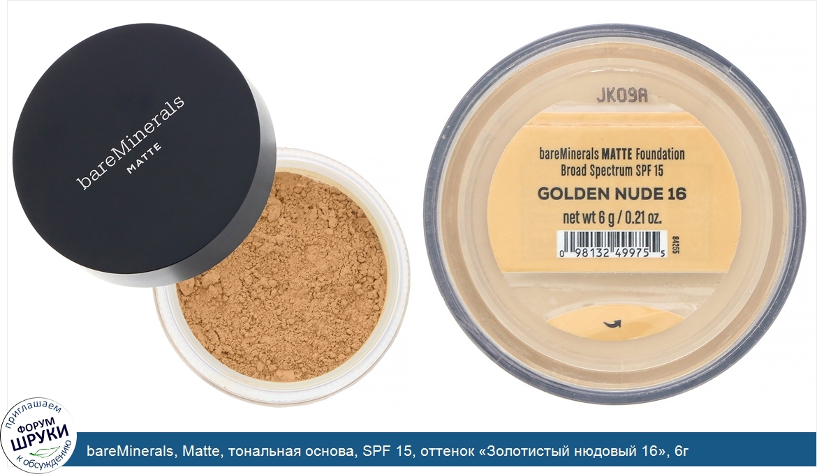 bareMinerals, Matte, тональная основа, SPF 15, оттенок «Золотистый нюдовый 16», 6г